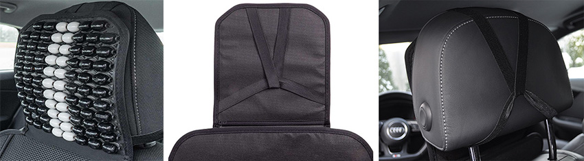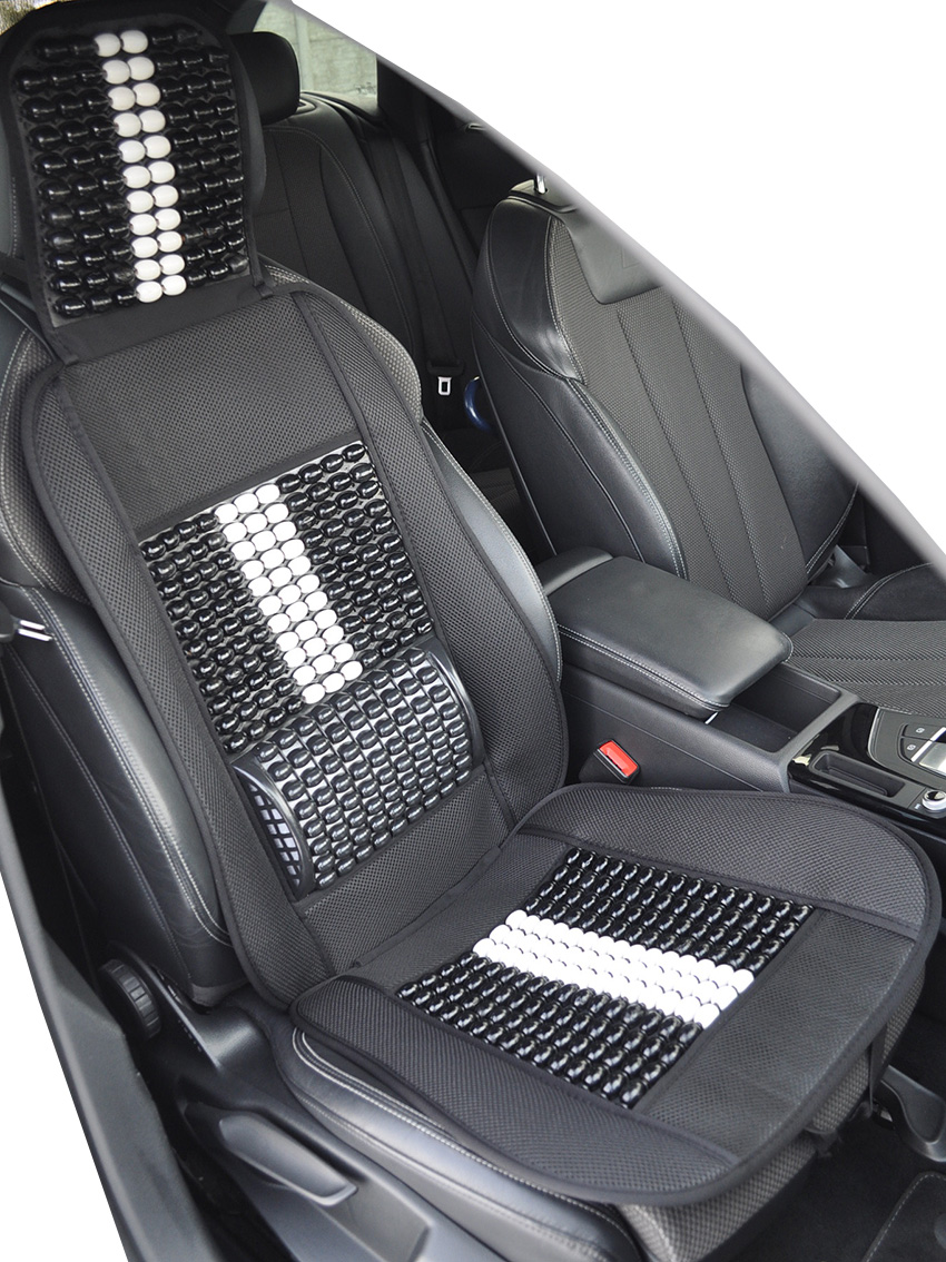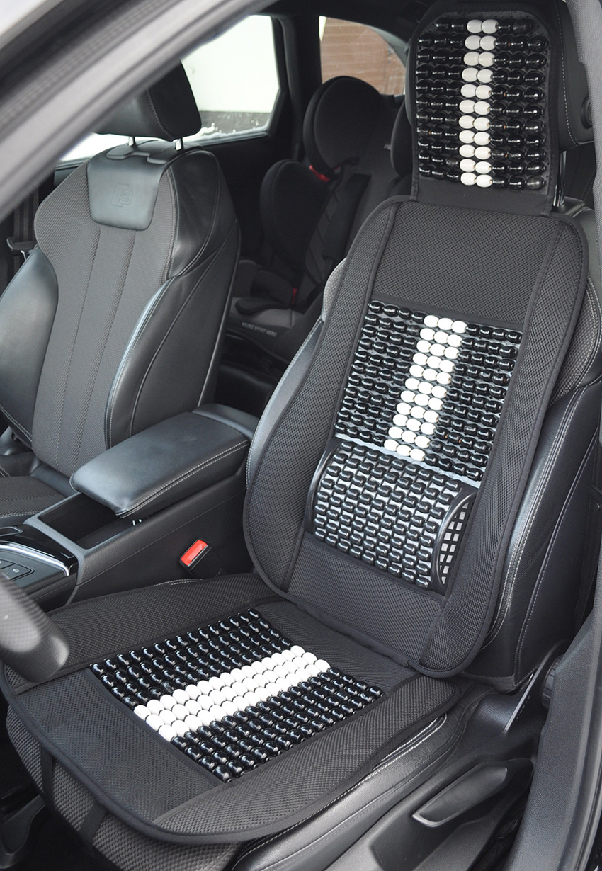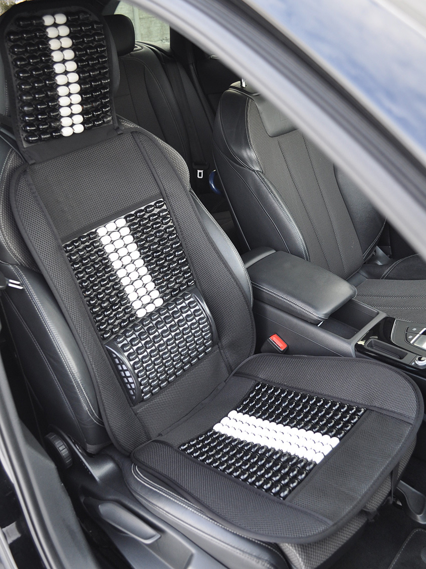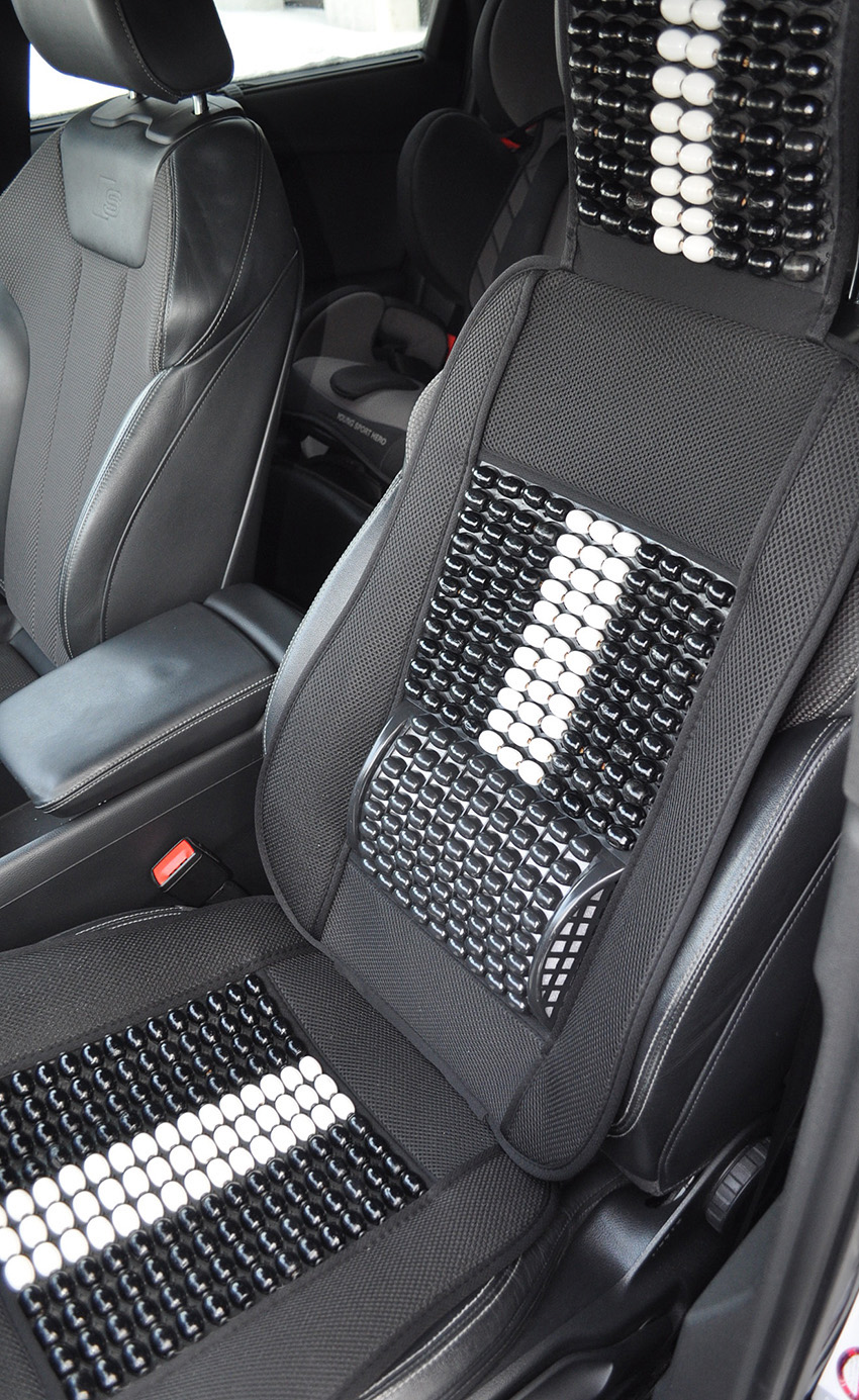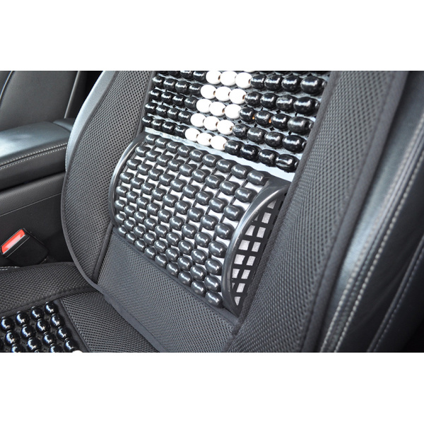 Mata profilowana na fotel samochodowy z zagłówkiem wykonana z drewnianych koralików spleciona mocną żyłką.