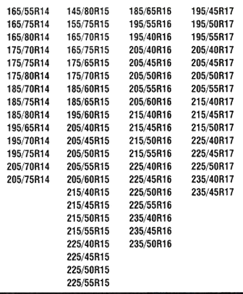 195/65/14 205/40/15 215/45/16 215/50/17